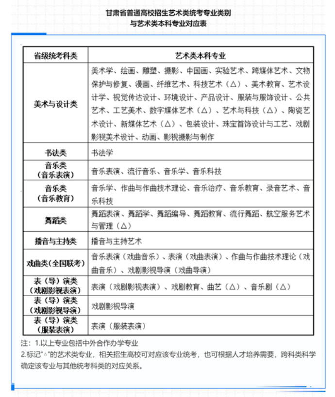 2.甘肃省普通高校招生艺术类统考专业类别与艺术类本科专业对应表