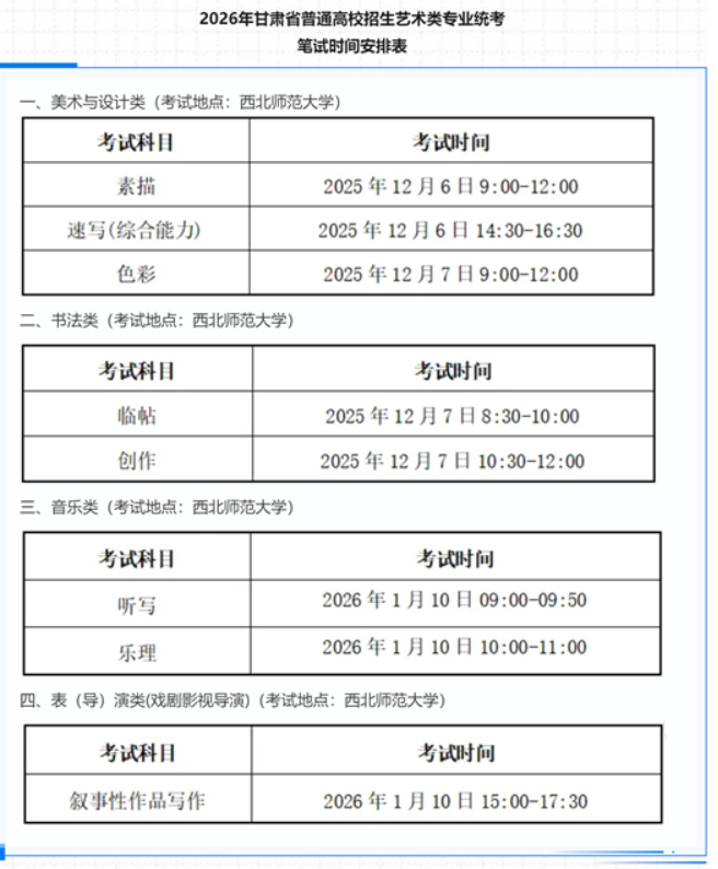 1.2026年甘肃省普通高校招生艺术类专业统考笔试时间安排表