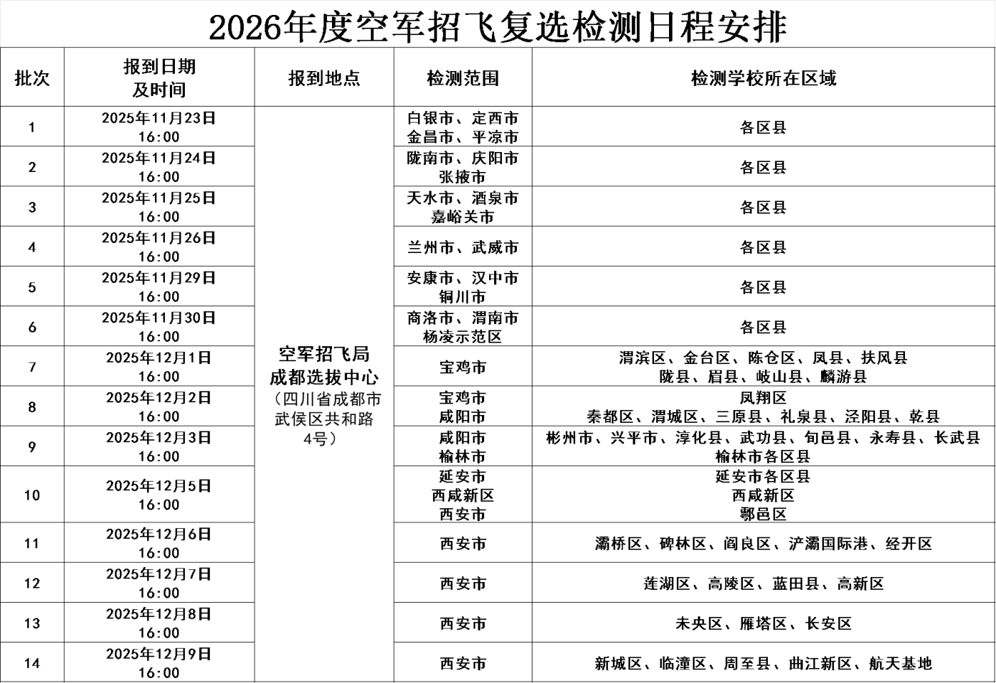 根据空军招飞年度工作安排,2026年空军招飞陕西省、甘肃省复选检测将于2025年11月23日—12月9日在成都招飞中心进行。参检学生请认真阅读此文,做好检前准备工作。