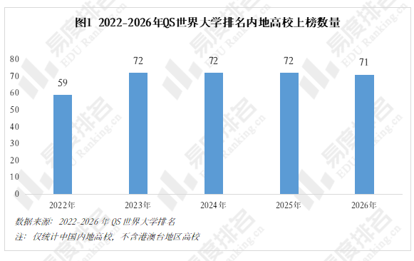 下图展示了近5年上榜QS世界大学排名的内地高校数量,2026年度有71所内地高校上榜,较上年度减少1所。2026年度