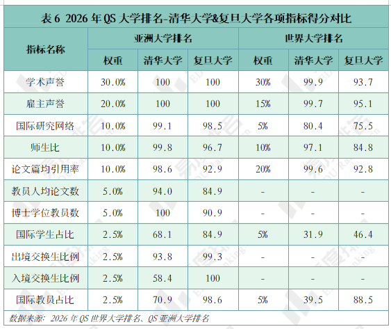 此外QS亚洲大学排名比世界大学排名多了教员人均论文数、博士学位教员数、出入境交换生比例4项指标,这些指标的纳入也对排名结果生产了不小的影响。
