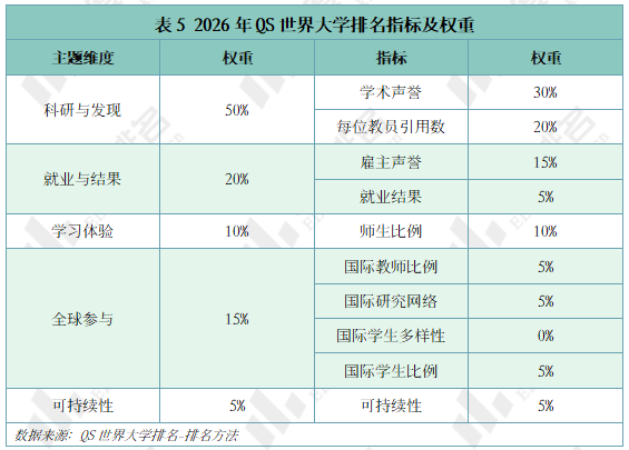 QS世界大学排名从五个维度、10个指标,按照一定权重计算各高校的综合得分,再根据综合得分对高校进行排名。QS世界大学排名各项指标及计算规则较为科学客观,社会对排名结果认可度也较高。