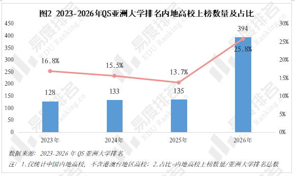 2026年度QS亚洲大学排名覆盖高校从987所大幅增加至1529所,进入QS亚洲大学排名榜单的中国内地高校也从135所增加至396所,内地高校的占比提升至25.8%,接近翻倍。