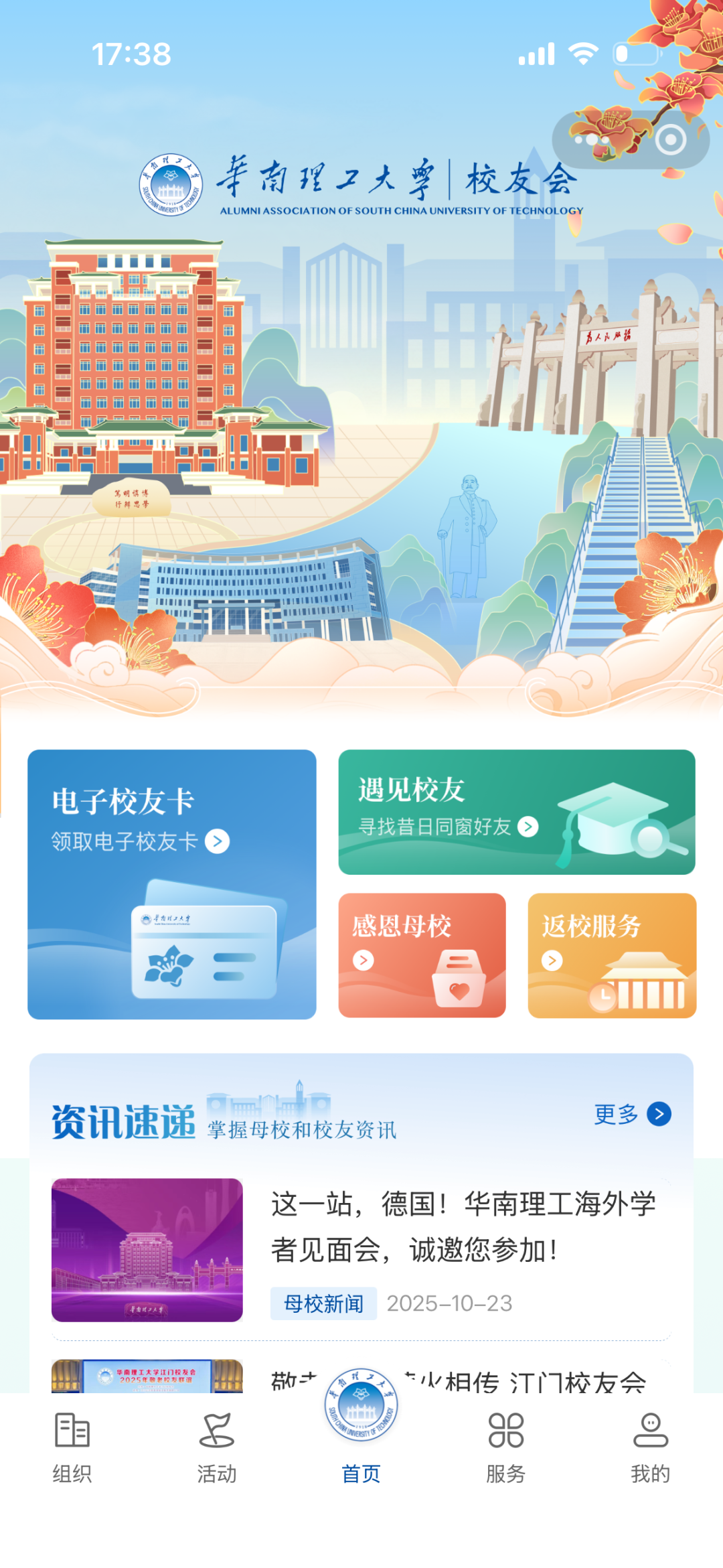 了解最新的资讯信息、校友风采、热门活动、热门服务等,与母校和校友组织同频共振。