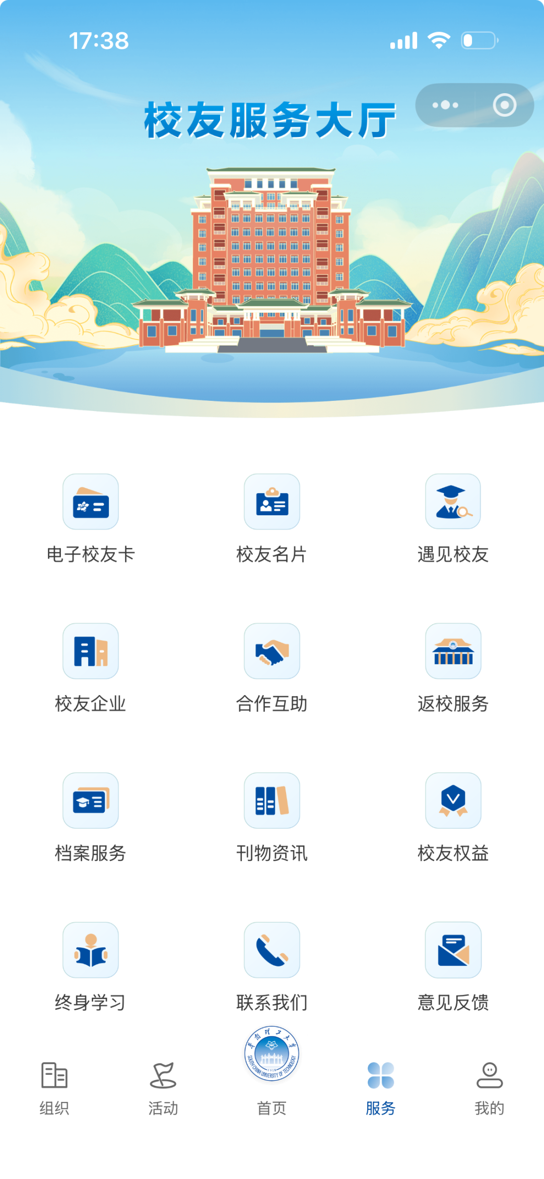 获取校友服务,包括申领电子校友卡、查找校友及校友企业、校企招聘、合作互助、返校预约、档案查询等。
