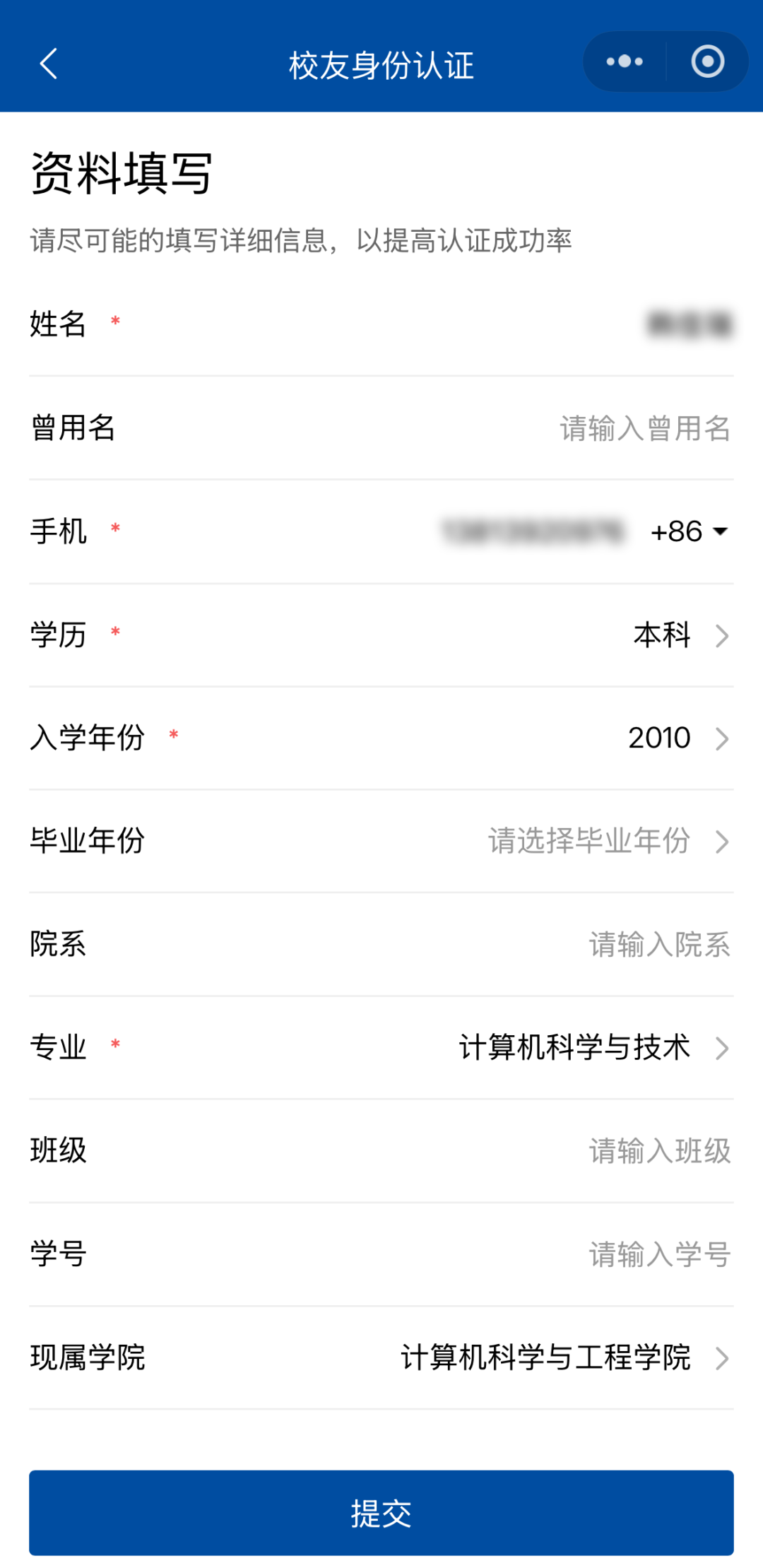 实名认证完成后请根据个人实际情况进行校友身份认证,填写相关资料信息,即可完成校友认证,您的名字下方就会出现“已认证校友”标识。