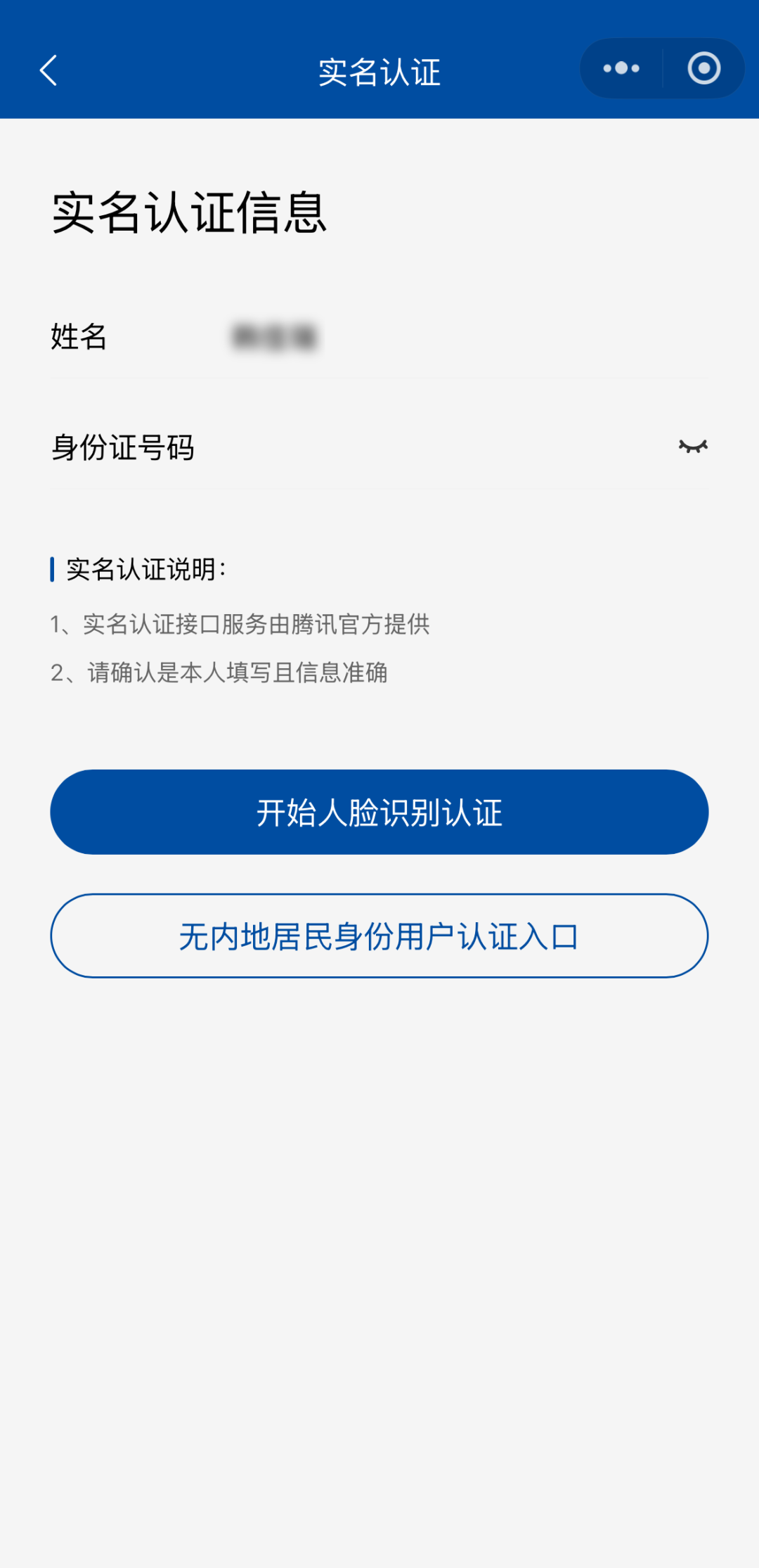 ④登录成功后请进行实名认证。拥有大陆居民身份证的校友可以直接进行“人脸识别”实名认证。