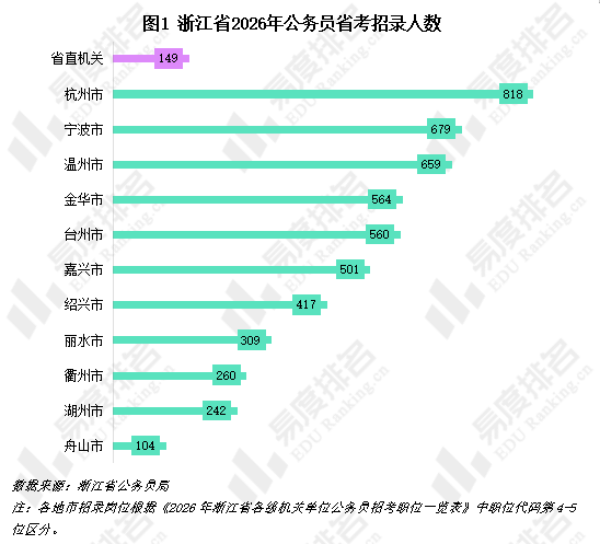 各地市公务员招录中,省会杭州市计划招录公务员人数最多,2026年计划招录818人,其次是宁波市、温州市,分别计划招录679人、659人。