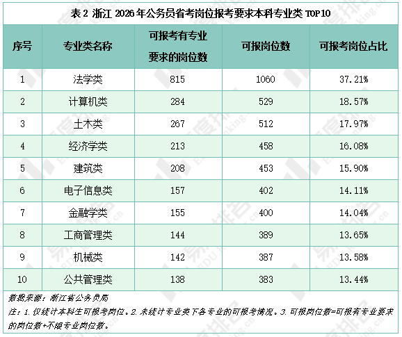 表2统计了浙江省2026年公务员省考可报考岗位TOP10的专业类,本次公务员招录有2849个岗位本科生可以报考,其中有245个岗位不限专业。