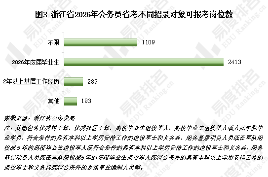 浙江省2026年公务员省考有约28%的岗位不限招录对象,有60%以上的岗位仅面向应届高校毕业生,累计88%以上的招录岗位面向应届生开放,利于促进高校毕业生就业。289个岗位要求招录对象有2年以上基层工作经历。