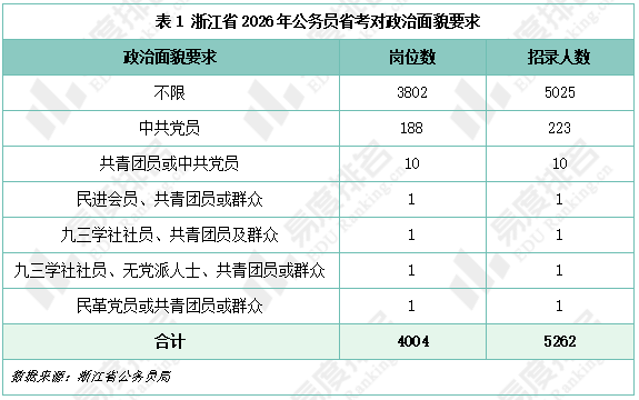 下表展示了2026年浙江省考公务员招录对政治面貌的要求情况。其中有188个岗位要求政治面貌为中共党员,有10个岗位要求中共党员或共青团员,不限政治面貌岗位数量占比约95%,不限政治面貌岗位为各类人才提供了平等的竞争机会,在一定程度上体现了公务员招录的公平性。