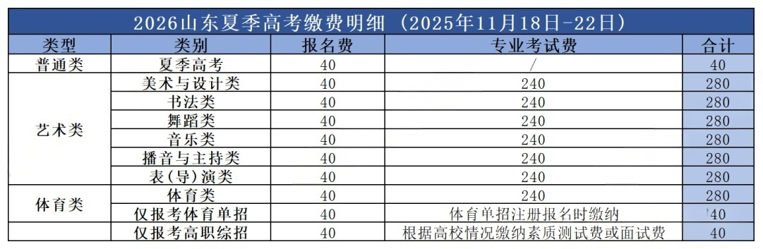 报名费:40元,缴费时间2025年11月18日-22日(夏考、综评考生均需缴纳)