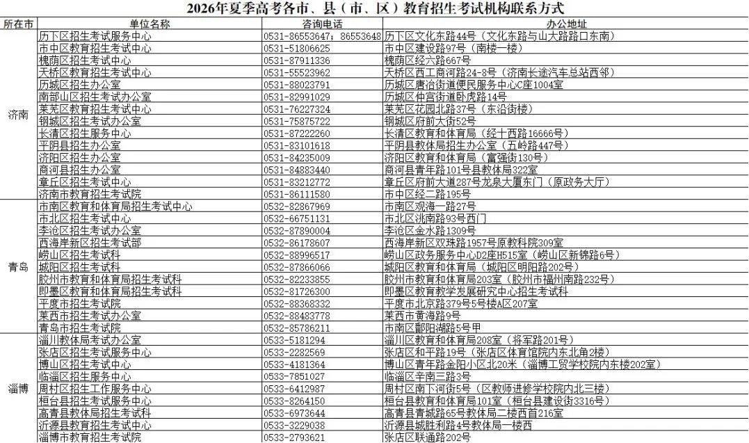 8.未尽事宜,请参阅山东省教育招生考试院官网首页(http://www.sdzk.cn/)“要闻速递”栏目《关于做好山东省2026年普通高等学校招生考试报名工作的通知》,也可以电话咨询市、区县招生考试机构。