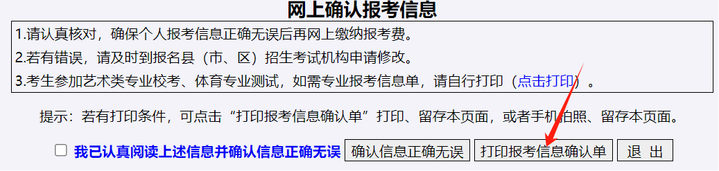 确认信息无误,勾选页面下方“我已认真阅读上述信息并确认信息正确无误”,点击【确认信息正确无误】按钮进入考生缴费页面。