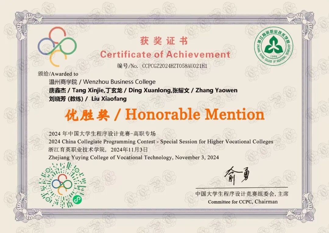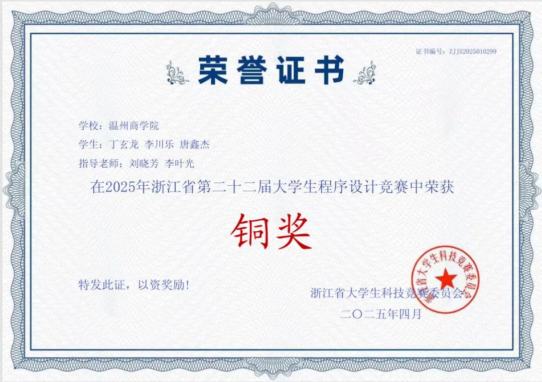 此外,他还在全国性、省级赛事中屡创佳绩:第十六届蓝桥杯全国总决赛全国二等奖、第七届传智杯全国IT技能大赛全国二等奖等5项国家级荣誉,“农行杯”浙江省国际大学生创新大赛银奖等8项省级荣誉,以及10余项校级荣誉,用一张张奖状书写着青春的奋进篇章。