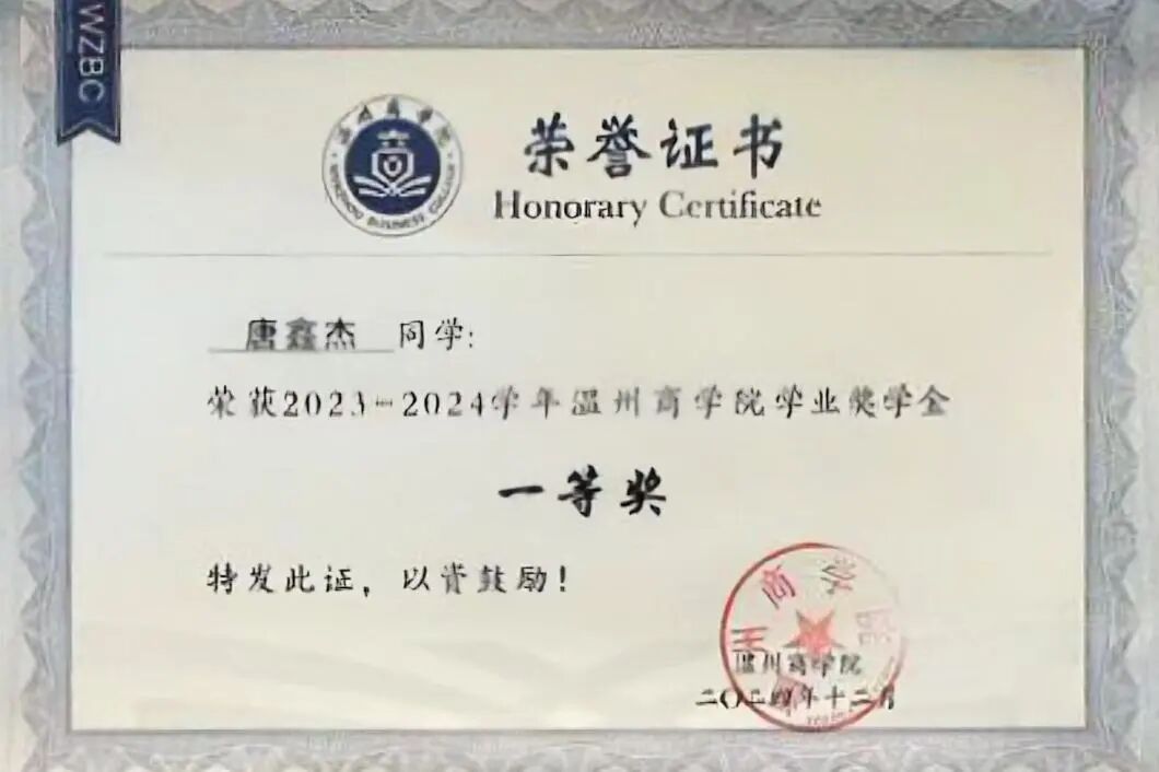 这份勤奋与专注也收获了诸多认可:2023-2024学年,他斩获浙江省政府奖学金、温州商学院学业一等奖学金,同时获评校三好学生、温州商学院国际学院“优秀学生干部”等荣誉称号。“唐鑫杰的学习态度和成绩,一直是班级同学的‘风向标’。”辅导员这样评价道,他不仅自己深耕专业,还主动分享学习方法,带动班级形成“比学赶超”的良好氛围。