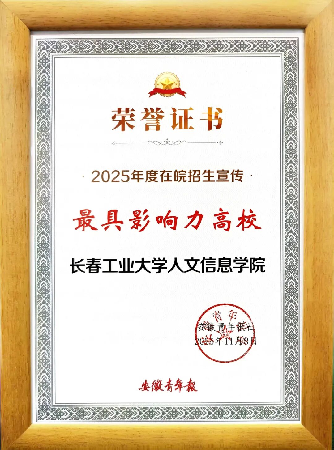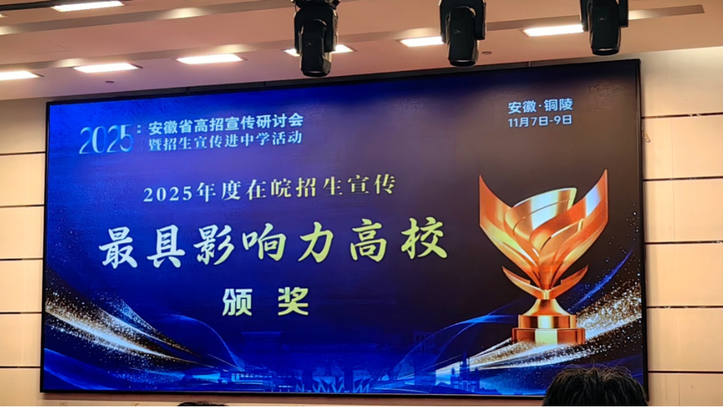 近日,安徽青年报组织召开“2025年度安徽省高招宣传研讨会暨招生宣传进中学活动”。我校凭借扎实的招生宣传举措与显著的工作成效,荣获“2025年度在皖招生宣传最具影响力高校”荣誉称号。