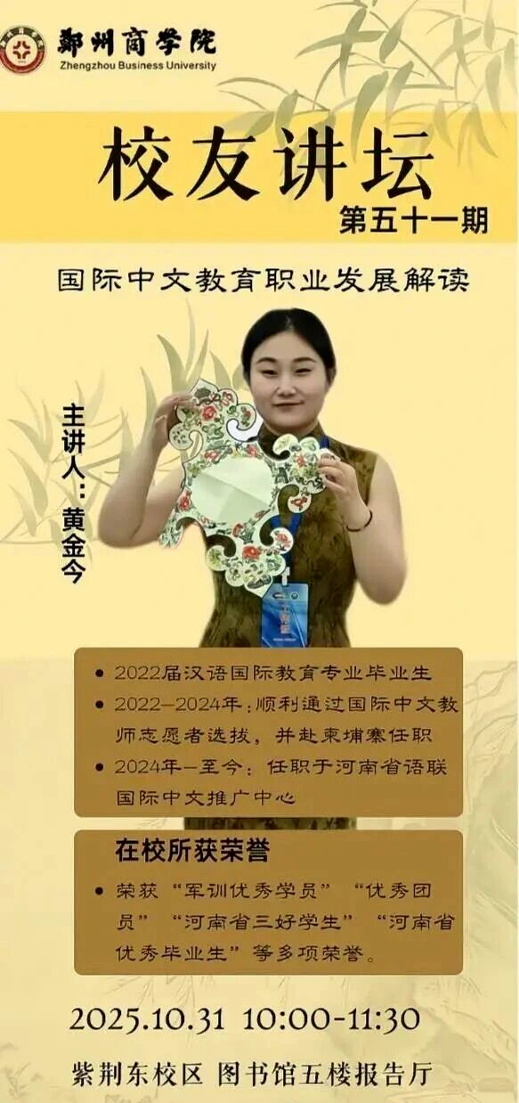 为汇聚校友智慧、彰显优秀校友的榜样引领效应,助力我校学子深化职业生涯认知、提升规划实践能力。10月31日,由招生就业处主办、文传学院承办的郑州商学院校友讲坛第五十一期在图书馆五楼报告厅顺利开讲。本次活动本次活动特邀我校22届汉语国际教育专业优秀毕业生黄金今担任主讲。