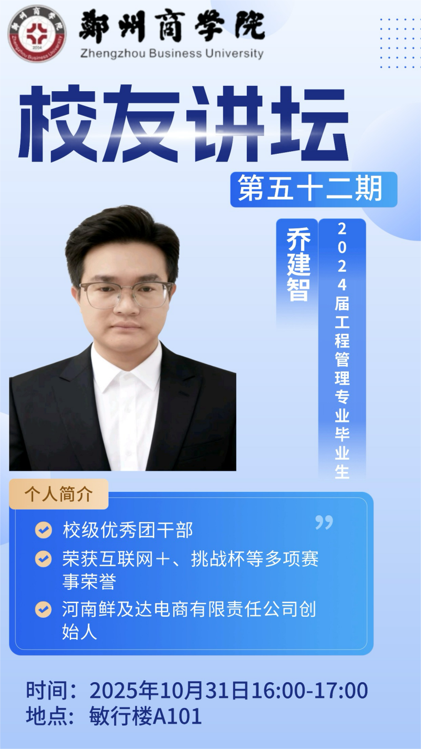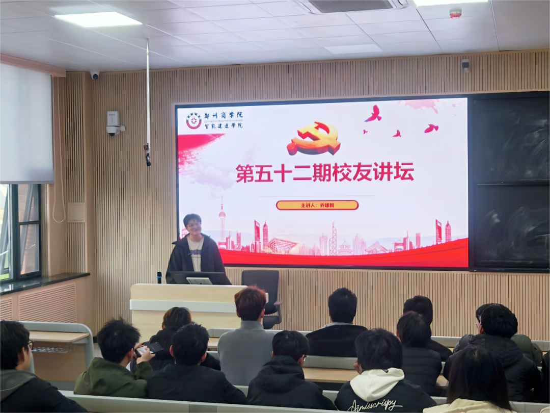 为发挥优秀校友的示范引领作用,帮助在校学生拓宽职业视野、提升实践能力,10月31日,由招生就业处主办、智能建造学院承办的郑州商学院校友讲坛第五十二期在敏行楼A101成功举办。本次讲坛特邀我校2024届工程管理专业优秀毕业生、河南鲜及达电商有限责任公司创始人乔建智担任主讲。