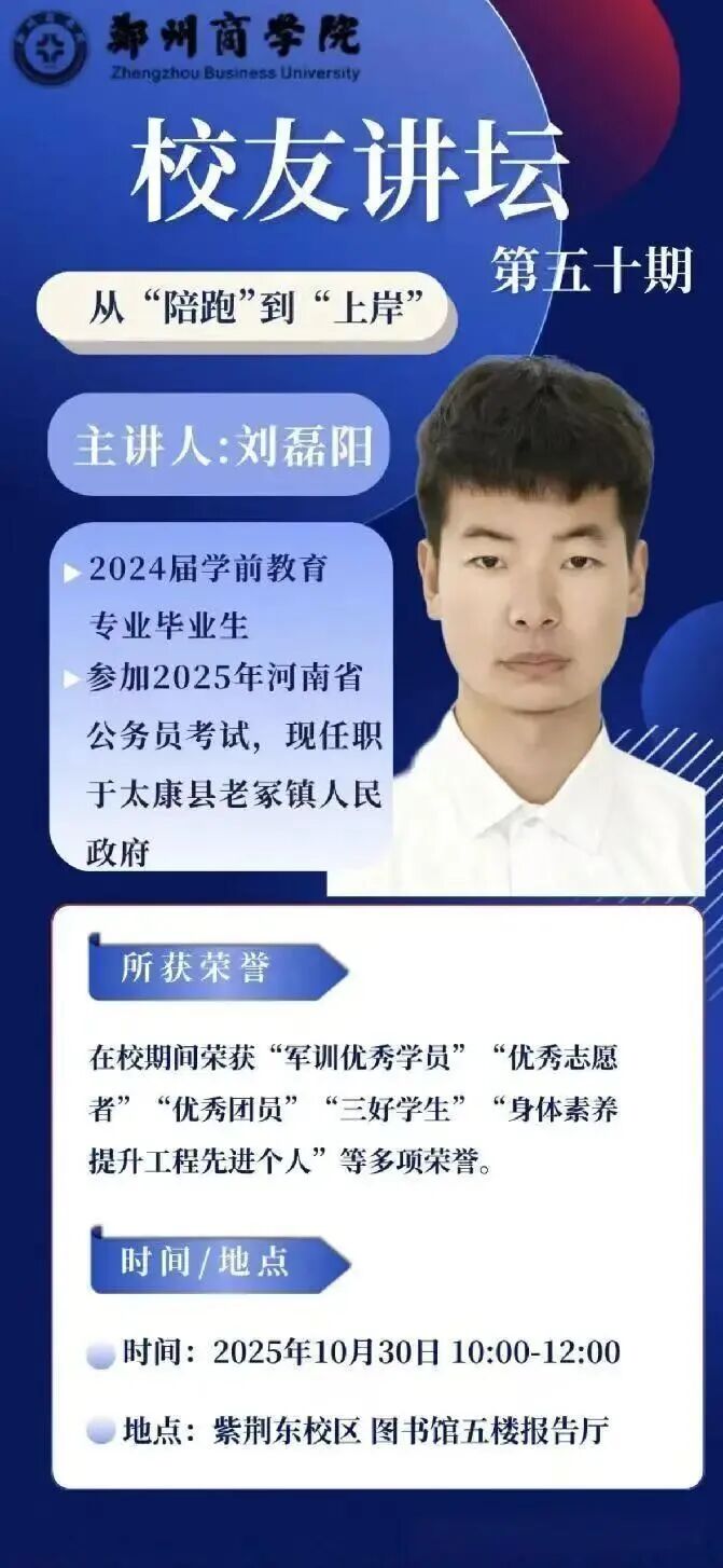 为凝聚校友力量,发挥优秀校友的榜样示范作用,助力我校学子提升职业生涯认知与规划能力。10月30日,由招生就业处主办、文传学院承办的校友讲坛第五十期在图书馆五楼报告厅顺利开讲。本次活动特邀文传学院2024届优秀毕业生刘磊阳担任主讲,由文传学院就业专员晋梦珂老师主持。