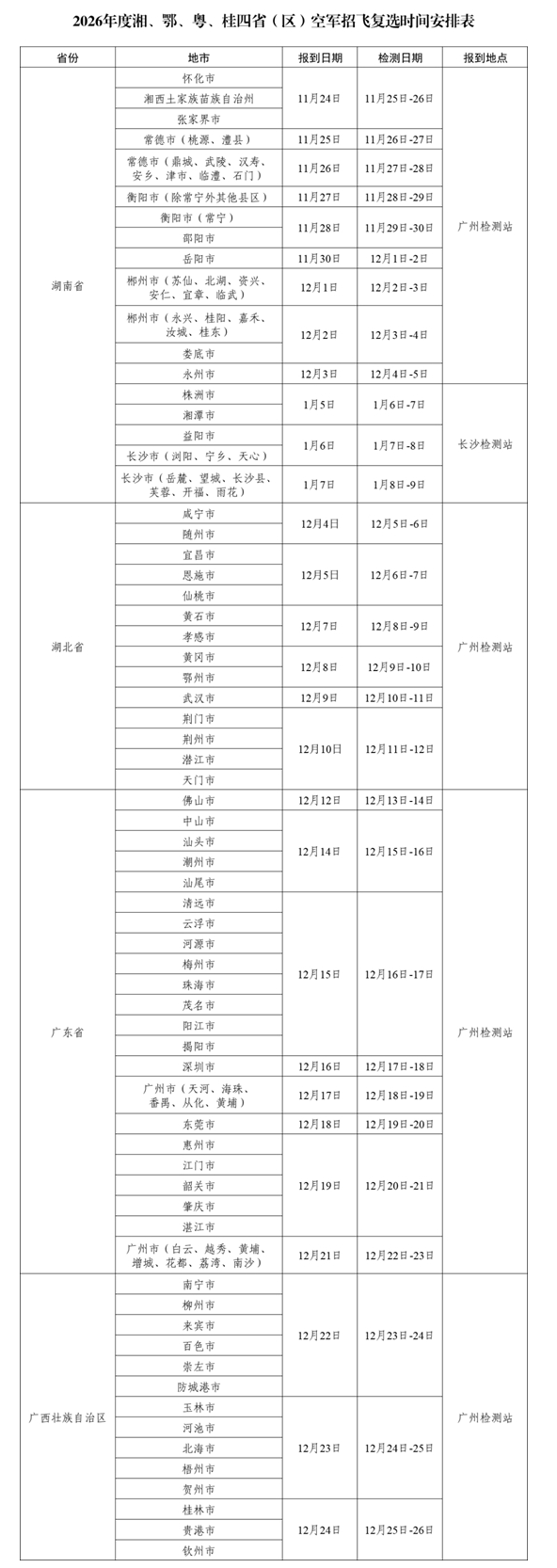 根据年度招飞工作安排,将于2025年11月24日至12月27日、2026年1月5日至1月9日,分别在广州市、长沙市设站,组织湘、鄂、粤、桂四省(区)空军招收飞行学员复选检测工作,现将有关事项通知如下: