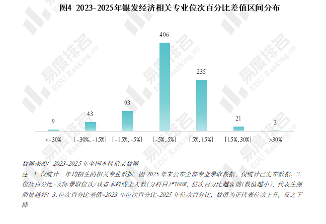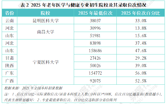 接着我们对近三年稳定招生的相关专业进行了一项有趣的分析,对比它们2023年和2025年录取位次百分比的变化。占比最大(50%)的专业集中在[-5%, 5%]区间,半数专业的录取位次保持高度稳定。同时,有约32%的专业录取位次显著提升超过5%,越来越多考生和家长正以实际选择看好银发经济前景。大多数与银发经济相关的专业,生源质量正在稳步提升或实现跨越式进步。随着行业前景进一步明朗、政策支持持续加大,未来或将吸引更多优秀学生加入。