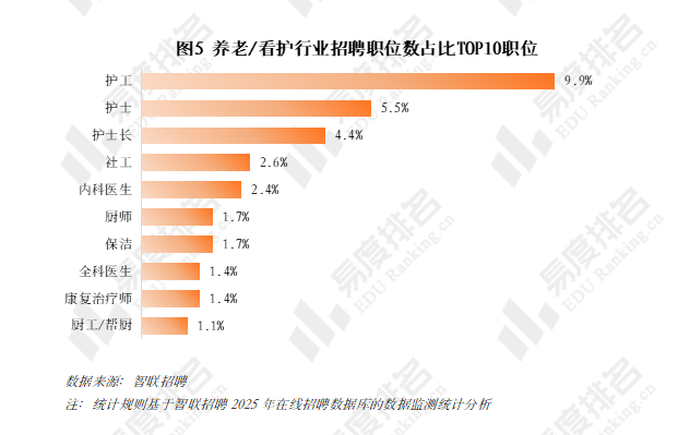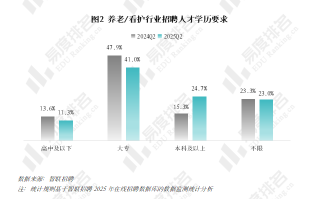 发展银发经济,专业人才是核心引擎。2025年第二季度,养老/看护行业的平均招聘月薪达到了8187元,相比去年同期增长了10%。要吸引人才,真金白银的投入是最实在的[3]。然而当前的人才储备状况不容乐观。首先,单从养老/看护服务的招聘情况来看,面临着留不住人与专业度不足的双重困境。