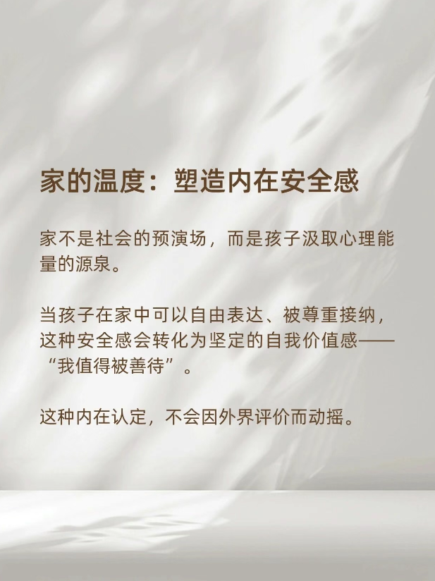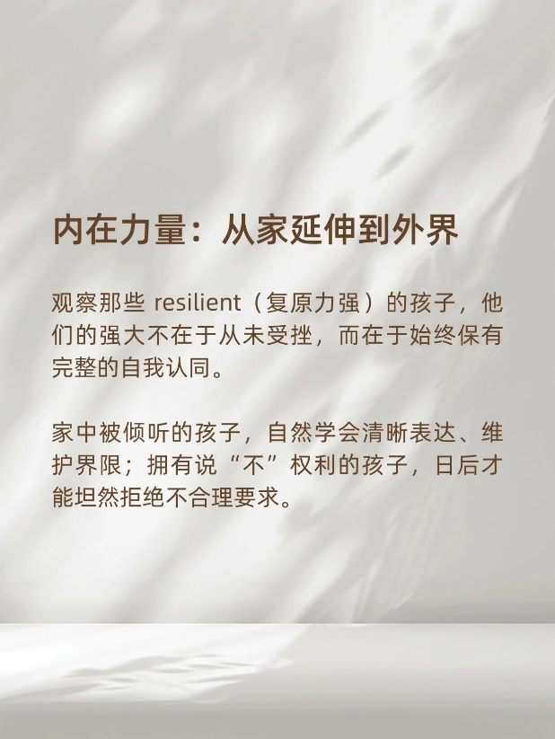 在家被尊重和理解的孩子,不会养成脆弱心态。相反,家庭给予的安全感与价值认同,会内化为他们面对外界最坚实的底气。这种从内而外的力量,让孩子懂得维护自我,从容应对挑战。真正的强大,始于家中被温柔以待的每一天。