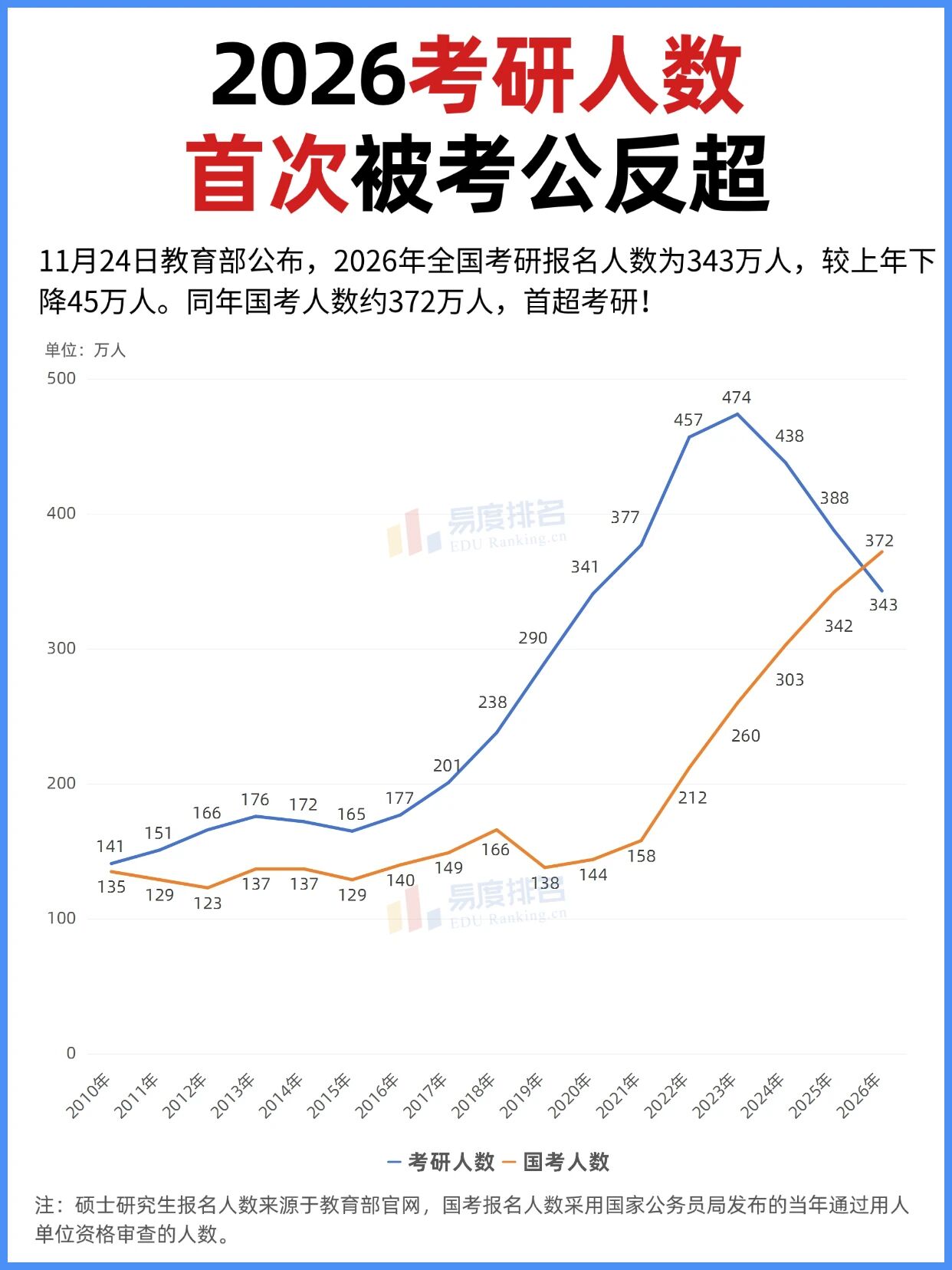这是国考人数首次超越考研,两条曲线在经过多年的此消彼长后终于交叉。