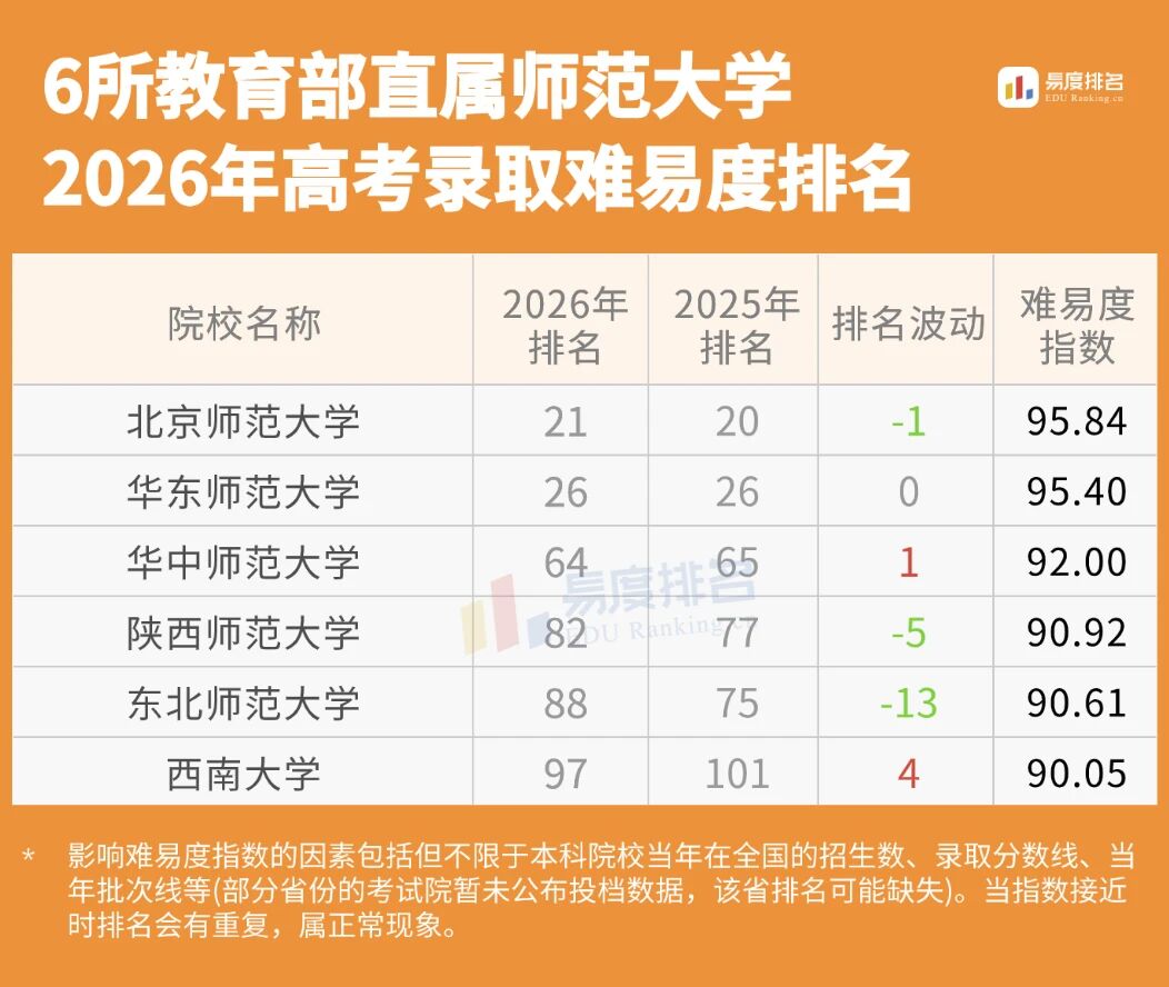 东北师范大学较2025年下降13名,是跌幅最明显的部属师范院校。可能由于部分专业仅分配至特定区域,学生报考意愿降低;同时,东北地区经济相对滞后,就业机会较少,本地生源减少,外地考生报考意愿降低 。