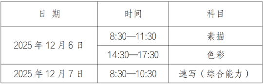 2.考生只能携带规定的考试用品参加考试:0.5mm黑色墨水签字笔、黑色铅笔、炭笔、水粉、水彩、丙烯颜料、钢笔、马克笔、蜡笔、彩色铅笔、铅笔刀、橡皮擦、透明胶带、大小不超过4K且双面平整的画板等