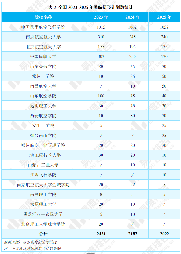 从近3年民航招飞院校的招生计划数来看,民航招飞的整体规模在逐步缩小,2025年全国计划招飞2022人,相比2024年减少165人,相比2023年减少409人。