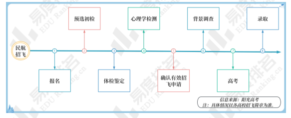 招飞工作一般从高考前一年的10月底开始报名,经过初检、体检及