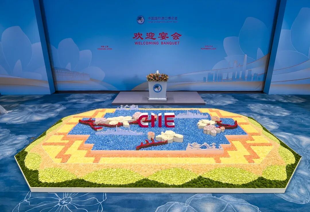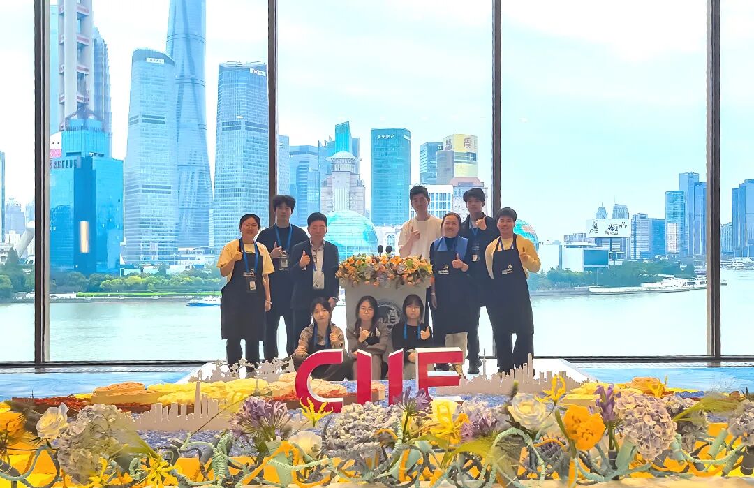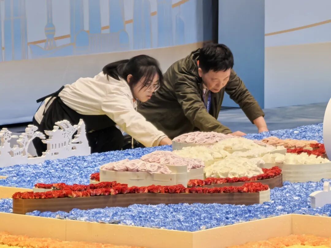 从方案设计到花材试做再到现场搭建,团队提前一个月设计,历经近20版方案打磨、试做与正式制作,周期长达10天,最终让兼具上海地域特色与进博时代气息的花艺作品在进博会绽放光彩。
