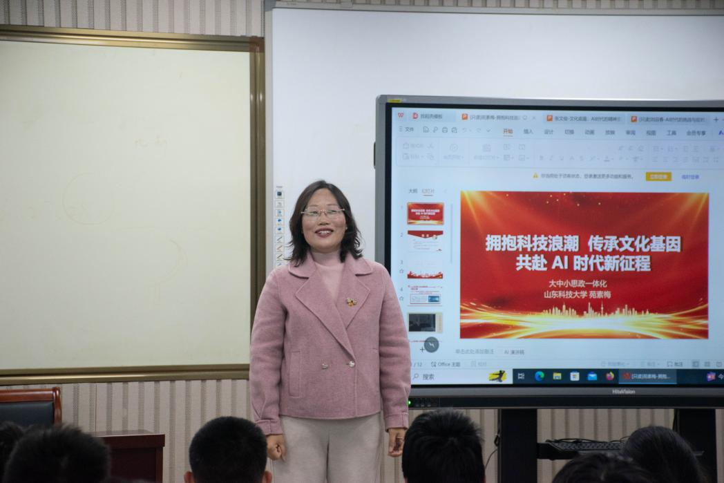 来自山东科技大学的青蓝学长张文俊、赵康翔、刘迎春、蔡欢欢结合自身在 AI 时代的学习与实践经历带来了一节节精彩的微思政课。学长们不仅展示了前沿科技的魅力,更强调了在技术浪潮中坚守人文精神与道德底线的重要性,分享如何将个人兴趣与国家发展需要相结合,深耕专业领域。这种“大手拉小手”的互动,打破了学段壁垒,为正处于人生关键选择期的高中生提供了宝贵的经验借鉴和清晰的榜样引领,真正体现了“青蓝逐梦”的实践意义。