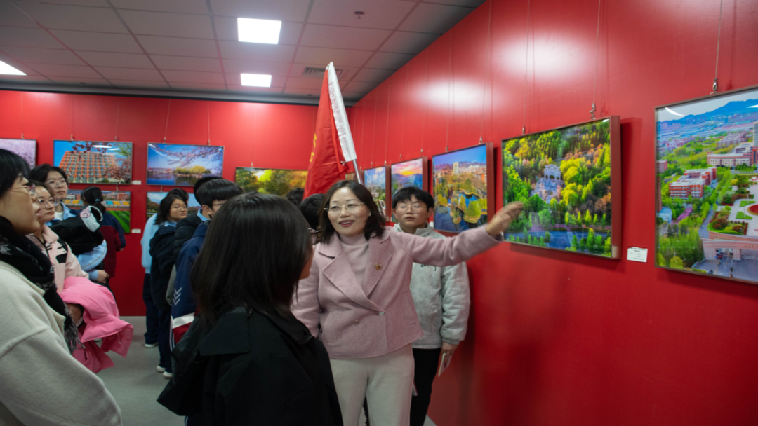 在优秀摄影作品前,同学们驻足欣赏。通过观赏作品,同学们全面了解了大学的校园风光,听着山东科技大学马克思主义学院苑素梅老师的讲解,同学们深化了对红色文化的理解,更坚定了为实现中华民族伟大复兴贡献力量的决心。