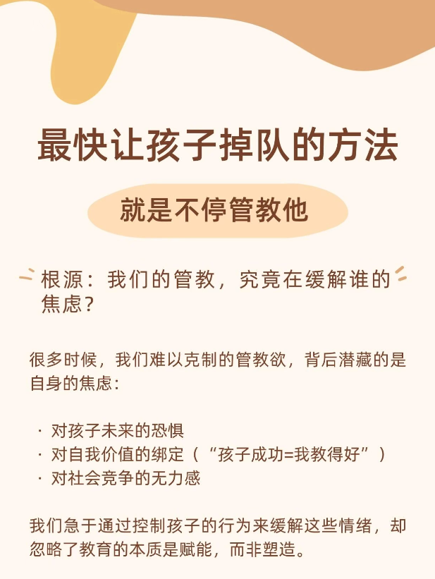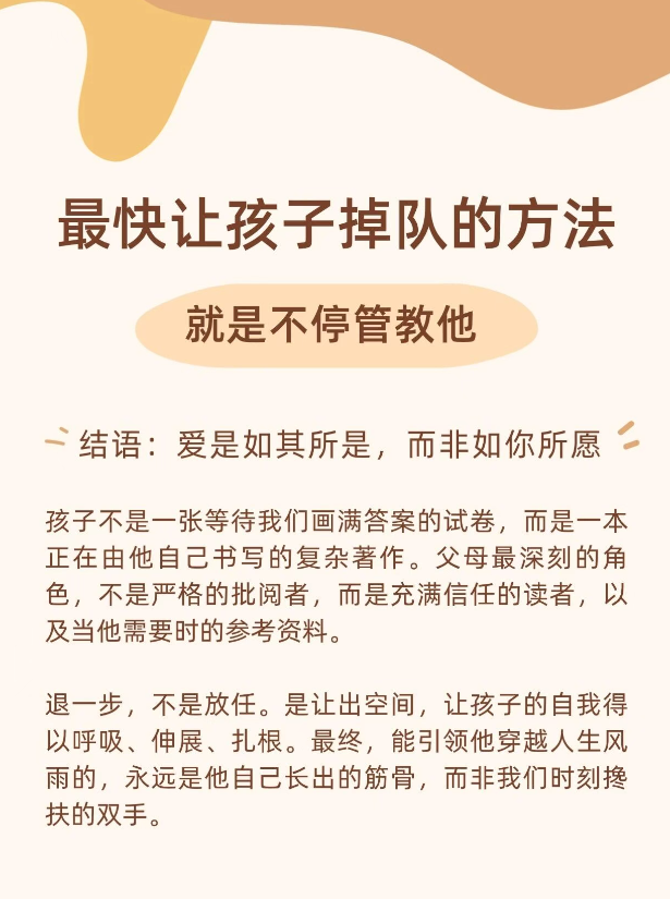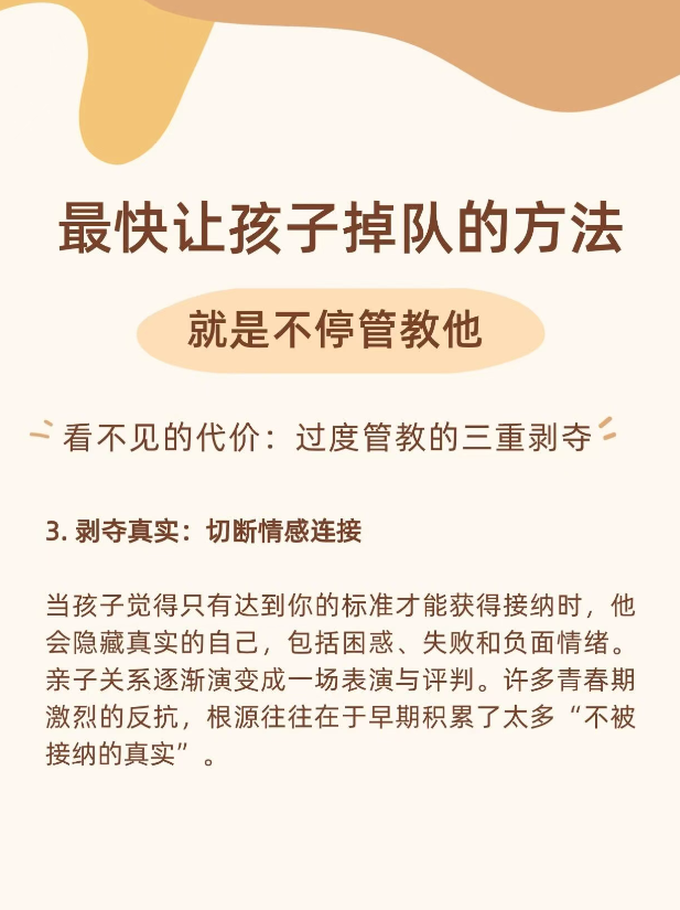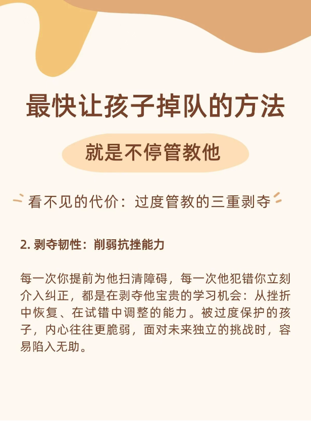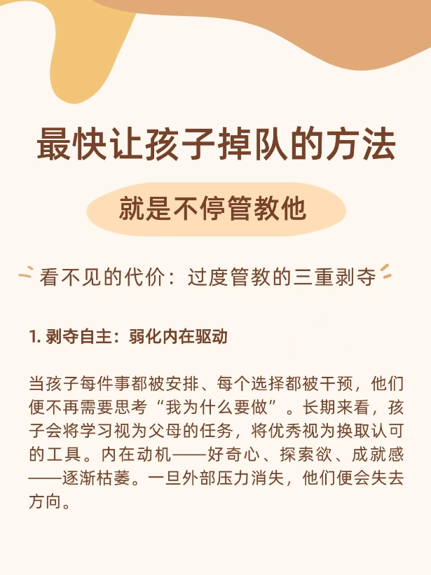 如果你希望孩子失去学习的热情,放弃独立思考的能力,与你渐行渐远,这里有一种经过验证的方法:持续不断地管教他。这不是危言耸听,而是心理学与教育学反复揭示的事实。过度管教如同过量的水,浇灌的不是根系,而是窒息。