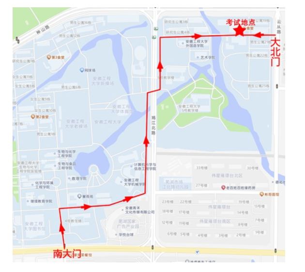 考生凭本人准考证进入学校,学校大北门(云从路)距离考场步行约5分钟,南大门(北京中路)距离考场步行约25分钟(考试期间,送考车辆不准进校)。
