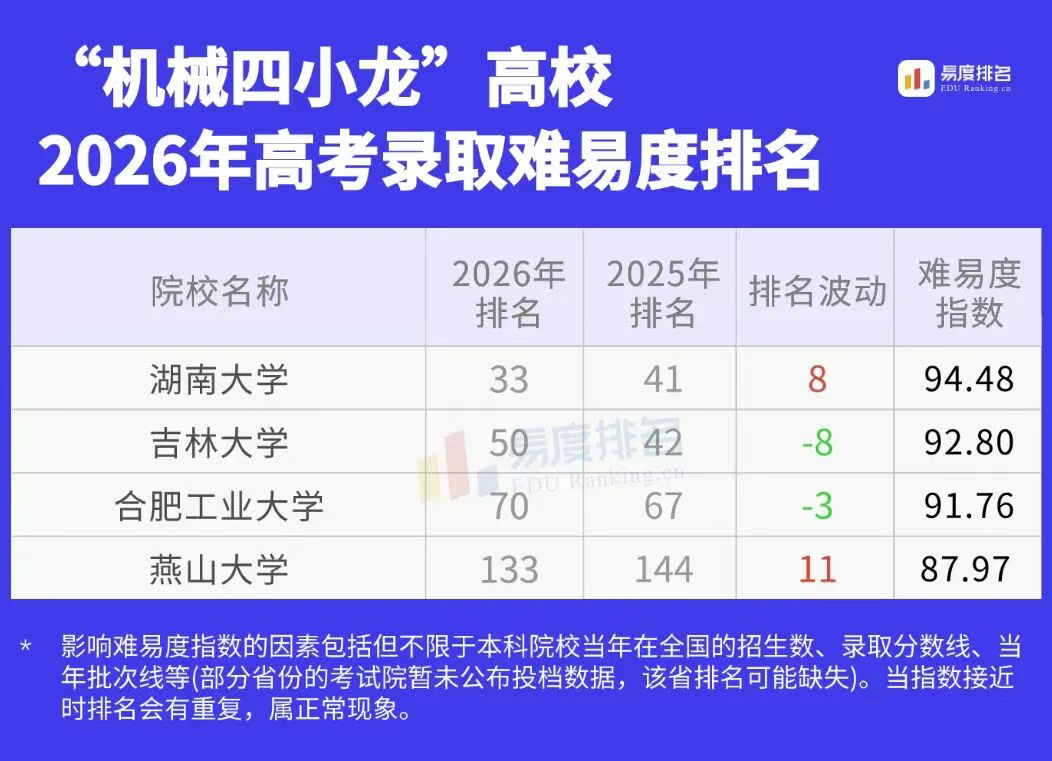 从985梯队的湖南大学、吉林大学,到211中坚合肥工业大学,再到双非学科强校燕山大学,“机械四小龙” 覆盖了不同分数段考生的择校需求,也在机械细分领域各有王牌壁垒。