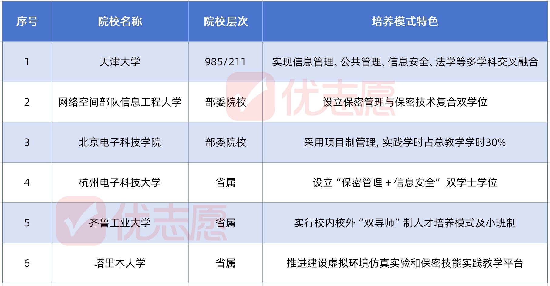 当前国内开设保密管理本科专业的院校数量为6所,分别是天津大学、杭州电子科技大学、北京电子科技学院、齐鲁工业大学、塔里木大学、网络空间部队信息工程大学。这些院校虽办学层次与特色各异,但均紧扣国家保密战略需求。