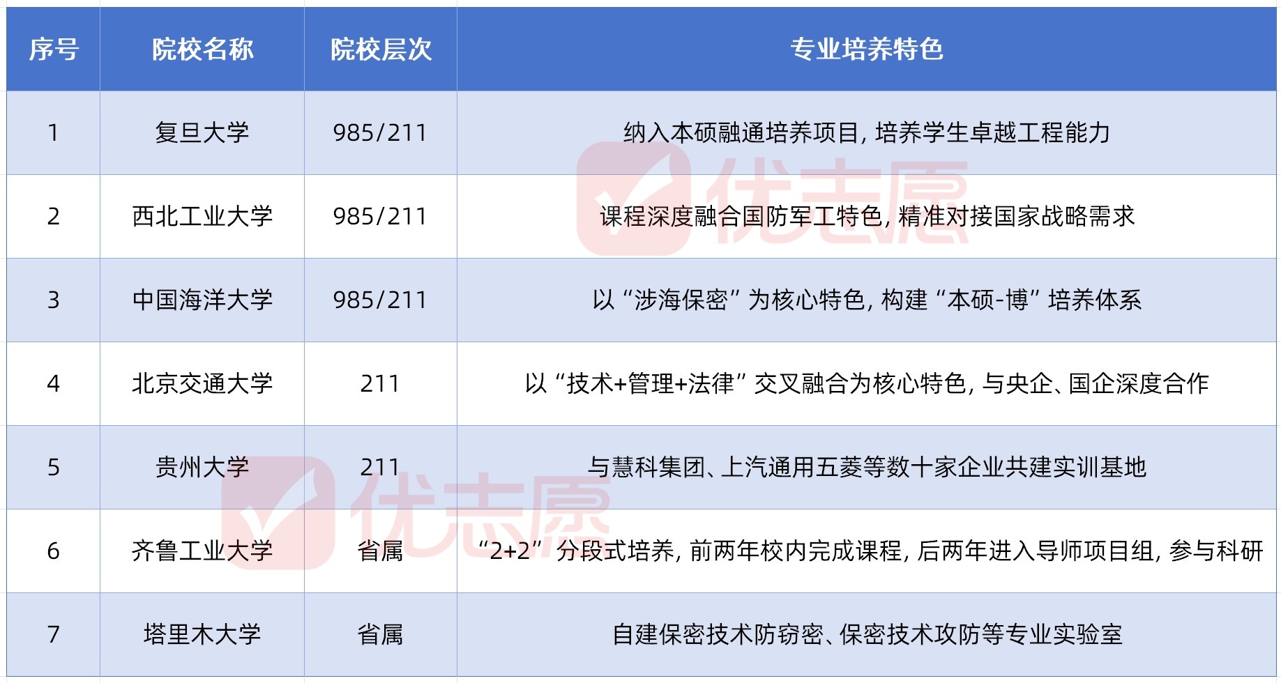 7所院校中有5所均为211,可见该专业教学培养质量绝对有所保障。值得一提的是,7所高校的保密专业均以国家保密战略与区域发展需求为核心导向,课程设置普遍融合技术、管理、法律多学科知识,通过实验室实训、校企合作实习、科研项目参与等强化学生的实践能力。