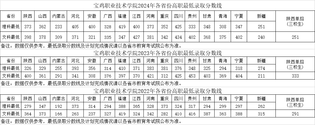 各位考生及家长,欢迎报考宝鸡职业技术学院,为方便大家了解学院历年最低录取分数线相关信息,特汇总如下: