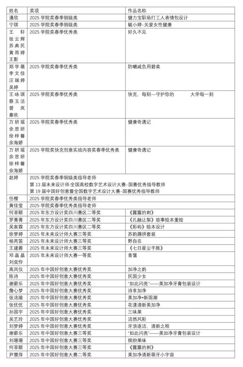 不负众望,再传捷报,热烈祝贺我院学子凭借扎实的专业素养和卓越的创新精神,在多项国家级、省级设计赛事中斩获佳绩:2025学院奖10项(铜奖3项、优秀奖7项),未来设计师大赛5项(一等奖1项、三等奖3项、优秀奖1项),东方设计奖3项(均为二等奖),中国好创意大赛14项(二等奖1项、三等奖3项、优秀奖10项)。此次佳绩,是学子们奋力拼搏的勋章,更是对老师和同学们付出的肯定。