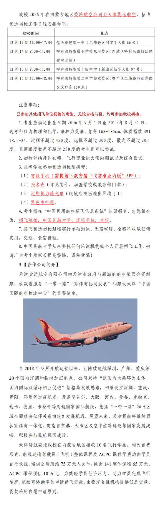 中国民航大学内蒙古地区2026年招飞预选初检日程安排