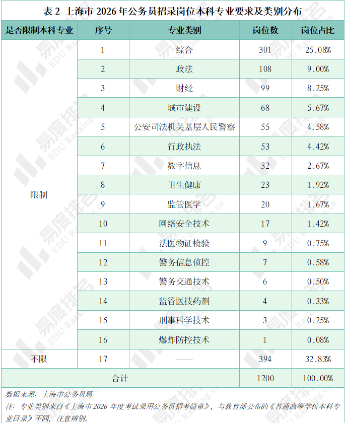 表2统计了上海市2026年公务员招录岗位对本科专业的要求情况,本次公务员招录有394个岗位对本科专业没有限制,在806个对本科专业提出限制要求的岗位中,有301个专业被划分为综合,即专业范围相对宽泛,其余有特定专业要求的岗位中,要求政法类专业的岗位最多,为108个,占比约为9%,也就是说政法类专业在2026年考公中依然具有最佳优势,其次是财经和城市建设等类别。
