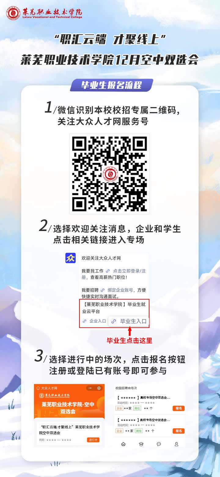 微信报名入口:微信扫描页面下方双选会二维码或微信搜索“大众人才网”关注公众号,企业和毕业生分别点击相关按钮进入莱芜职业技术学院专场,点击报名按钮,注册或登录已有账号即可直接参与。