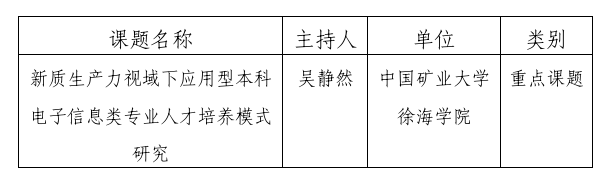 近日,江苏省教育科学规划领导小组办公室公布2025年度省教育科学规划课题立项名单,徐海学院信电系副教授吴静然申报的课题《新质生产力视域下应用型本科电子信息类专业人才培养模式研究》获批重点课题立项。