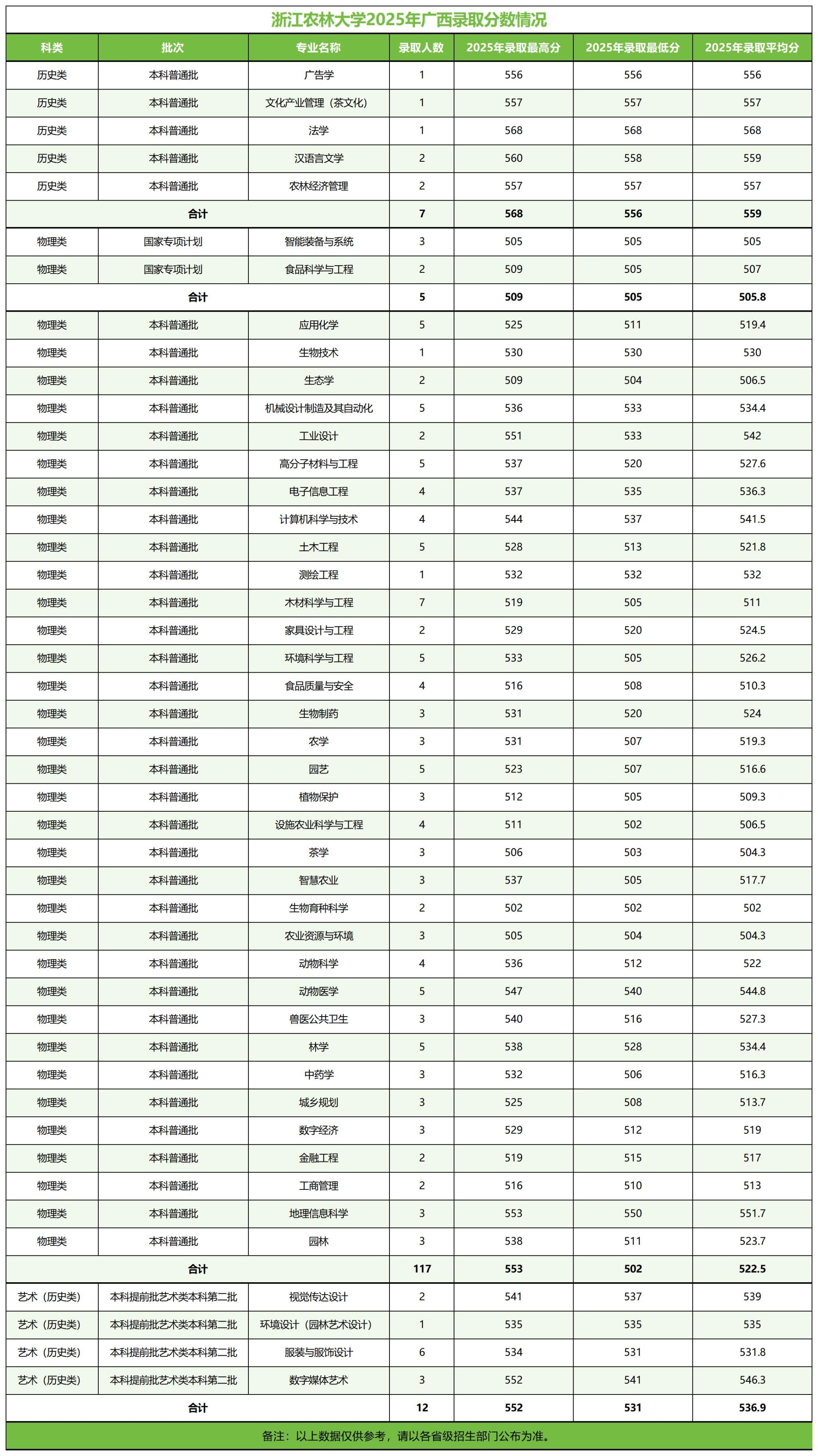 2025年浙江农林大学广西录取分数情况