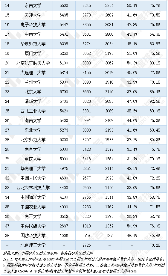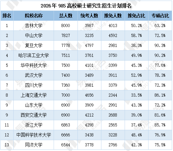 近年我国研究生教育规模不断扩大,同时专业学位研究生占比也在不断提高。目前我国头部高校研究生招生规模达到什么程度?其专硕占比上升到什么水平了呢?本文对39所985高校2026年的硕士招生计划人数进行排名,并对比各高校硕士招生计划中推免生(不用参加研究生考试直接读研)的占比以及统考计划中专硕生的占比。