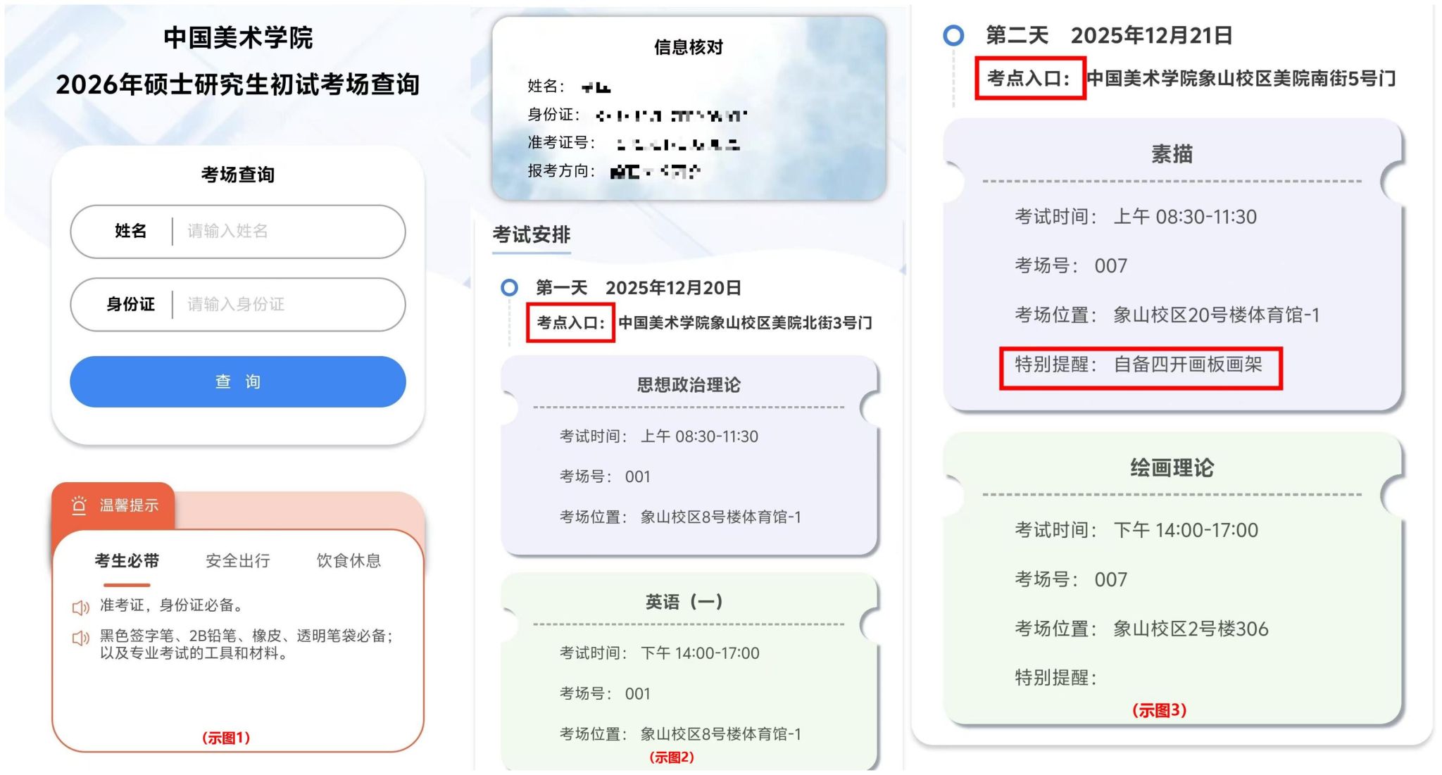 6、考生须自带考试相关文具及与自身报考专业相关的考试工具、绘画材料等,如有特殊要求将会在考场查询特别提醒上说明(见示图3红框)。请考生自备干粮、饮用水,学校主动提供用餐服务。